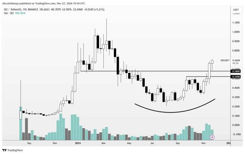Pseudonymous analyst Altcoin Sherpa tells his 232,200 followers on the social media platform X that Sei (SEI) looks bullish after breaking out of a rounding bottom pattern on the weekly chart.