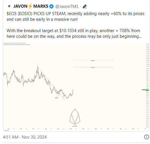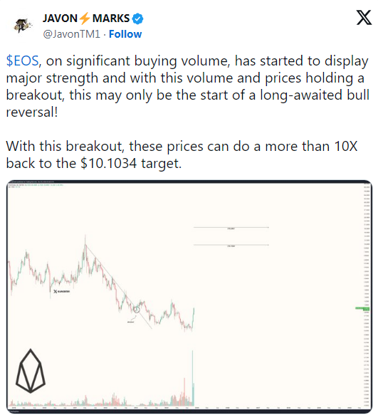 WikiBit 2024-12-01 13:03EOS breakout signals a bull reversal with strong buying volume.Analysts predict a potential 10X rall