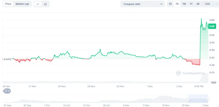 MOODENG rallied from its recent lows up to $0.60. | Source: Coinmarketcap