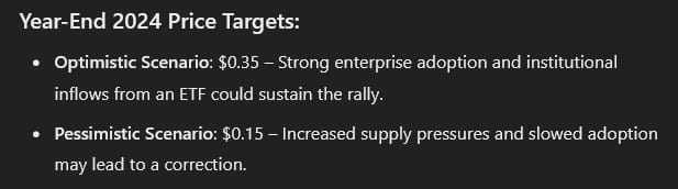 In the first case, GPT-4o predicted that HBAR prices could reach as high as $0.35, if strong enterprise adoption is sustained and the asset experiences significant capital inflows from the aforementioned Canary Capital ETF.