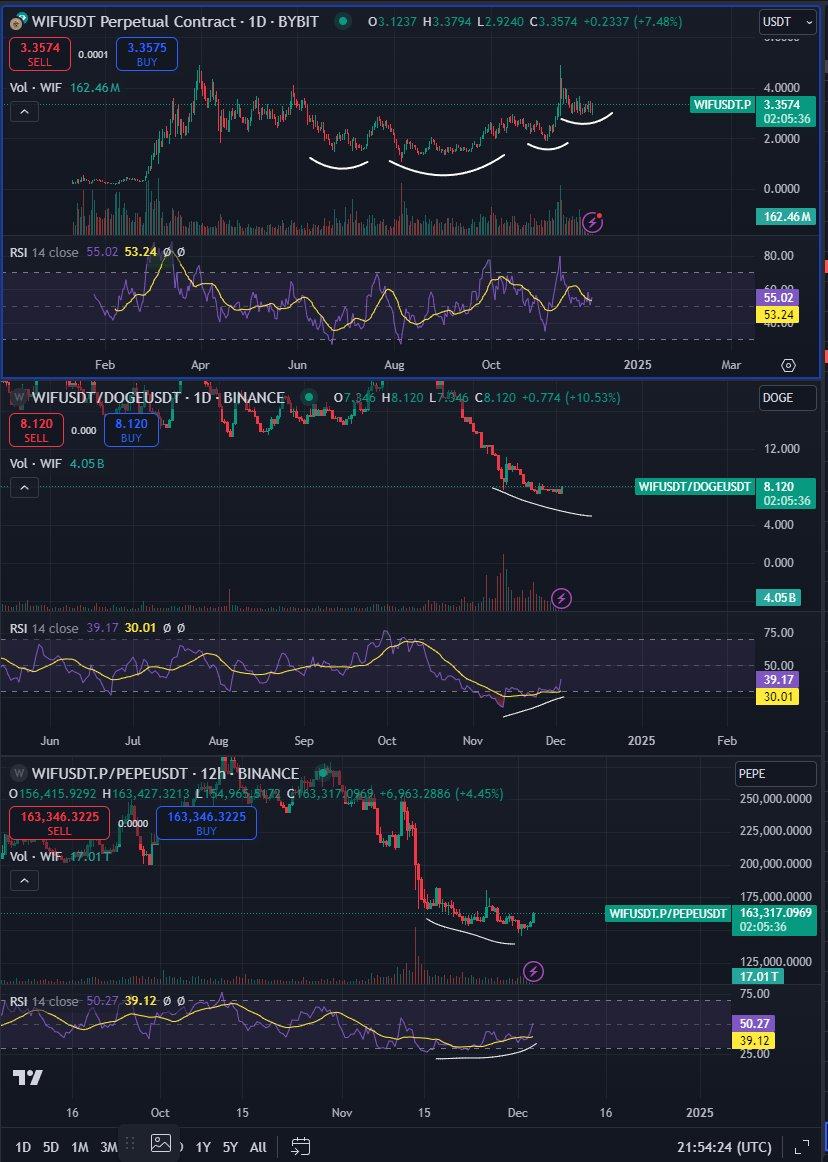 Double daily divergences against doge and double 12-hour bull divergences against PEPE.