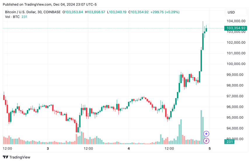Bitcoins price has continued to climb since surpassing $100K, and as of press time, is trading around $103,000 on Coinbase, according to TradingView data.