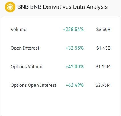BNB‘s explosive rally follows a sharp spike in trading volume, with its 24-hour trading volume reaching $6.32 billion, up by 124% from previous levels. According to CoinGlass, BNB’s derivatives market volume soared by 228%, while open interest rose by almost 32%. This suggests strong speculative interest and growing investor optimism in BNB's further price gains.