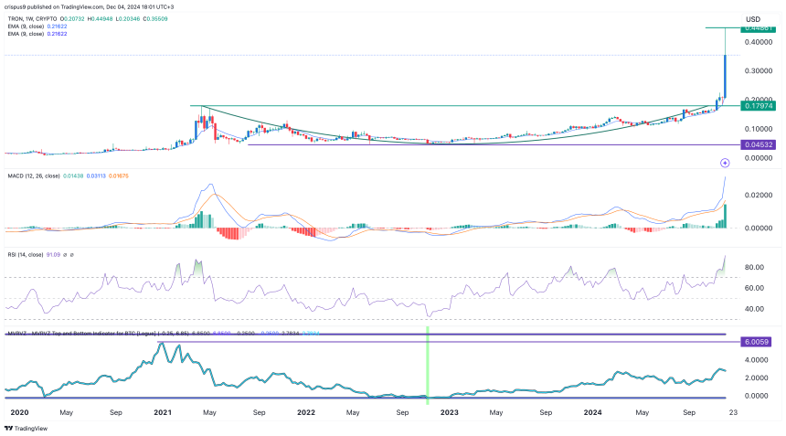 Tron has moved above all moving averages, while the MACD and Relative Strength Index have reached extreme overbought levels.