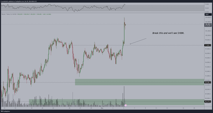 Lastly, the analyst predicts that Bitcoin will start consolidating after breaking through the $100,000 resistance level, setting the stage for altcoins to break out.