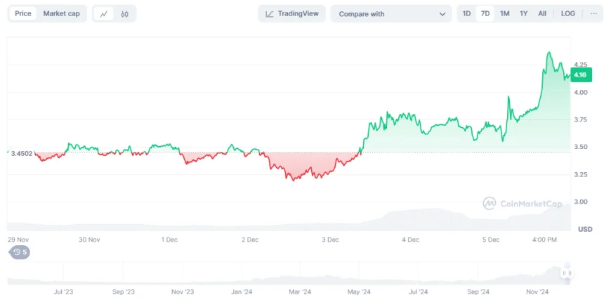 Just before the announcement, SUI extended its rally, peaking at $4.49. Later, the native network token slid to $4.19. Trading volumes reached an all-time high at $4.16B for the past 24 hours, after an extended period of active trading. The current rally set expectations for SUI going above $7, continuing its bull market into 2025. SUI is also considered a prime candidate for being added to a Grayscale investment product.