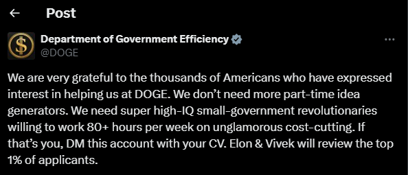 In mid-November, the Department for Government Efficiency posted on its X account, urging potential candidates to apply by sending their CVs.