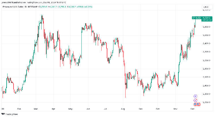 WikiBit 2024-12-07 00:48The price of Ethereum's ether (ETH) broke above the $4,000 mark on Friday for the first time since M