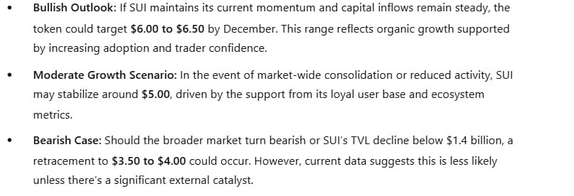 In a bullish scenario, SUI could surpass $6, reflecting sustained demand and network activity. However, under moderate market conditions, the price may consolidate around $5.00. In a bearish case, the token could retreat to the $3.50–$4.00 range.