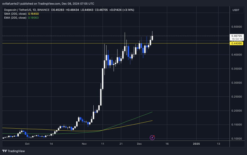 If this momentum continues, Dogecoin could be on the verge of extending its recent gains, with many market participants eyeing the $0.50 psychological level as the next target. A successful breakout above $0.50 could pave the way for even higher levels, further fueling the ongoing rally. However, failure to maintain its upward trajectory might lead to a period of consolidation.