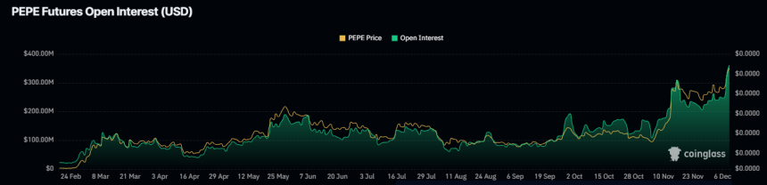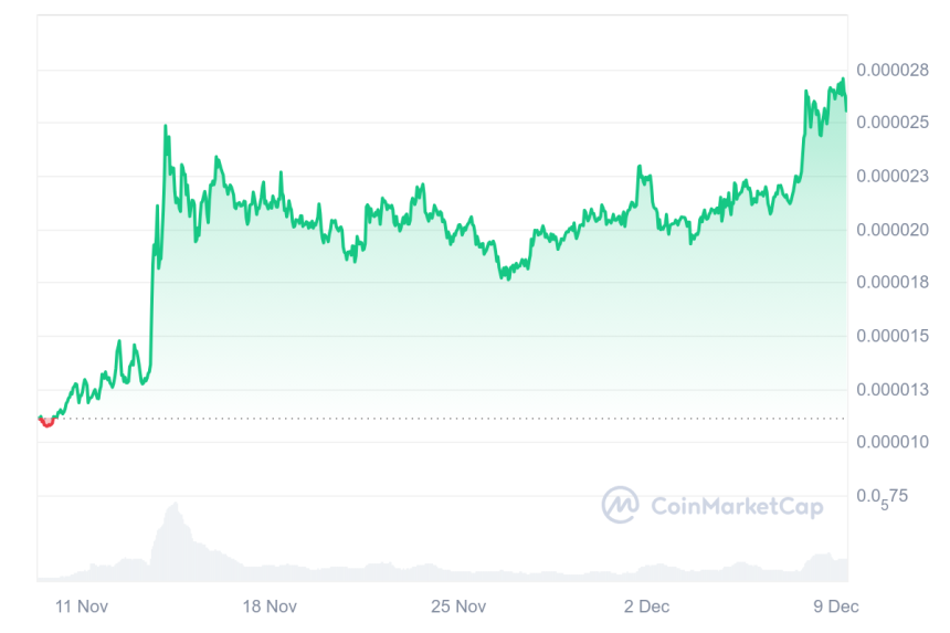 PEPE‘s price jumped by 33.9% in just a few days, moving from $0.000020 to $0.000028 between December 5 and December 9. As a result, the memecoin’s market cap broke past $11 billion, making it the 20th largest crypto globally.