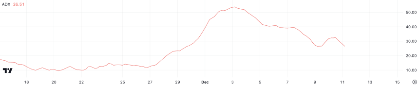 Helium Average Directional Index (ADX) is currently at 26.5, a significant drop from over 50 just one week ago. During that time, its price reached levels above $9, marking the first time it hit those highs since March 2024.