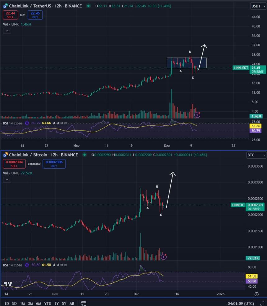 The analyst pseudonymously known as Bluntz tells his 304,200 followers on social media platform X that Ethereum (ETH)-based decentralized oracle Chainlink (LINK) may surge after completing an ABC correction on the 12-hour chart.