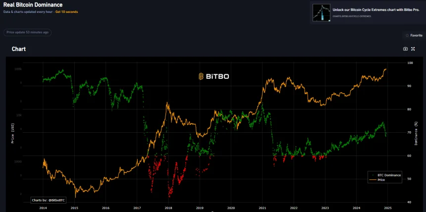 The true BTC dominance index reflects a shift in direction. BTC dominance is measured against mined coins, excluding stablecoins and tokens. | Source: Bitbo