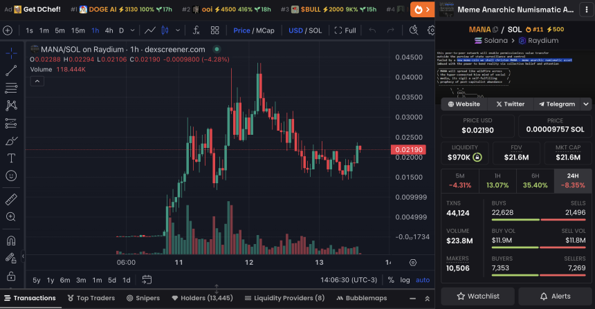 MANA was initially launched on Pump.fun and later graduated to Raydium, the largest decentralized exchange (DEX) on Solana. Since its launch nearly four days ago, MANA has gained significant traction among newly launched coins, amassing over 13,000 holders.