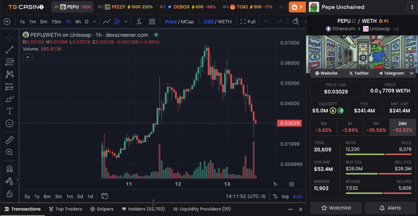 Despite being down more than 50% in the last 24 hours, PEPU has quickly established itself as a potential rising star among meme coins in the Ethereum ecosystem. Launched just three and a half days ago, it has already attracted over 60,000 holders and sees a daily trading volume of $52 million.