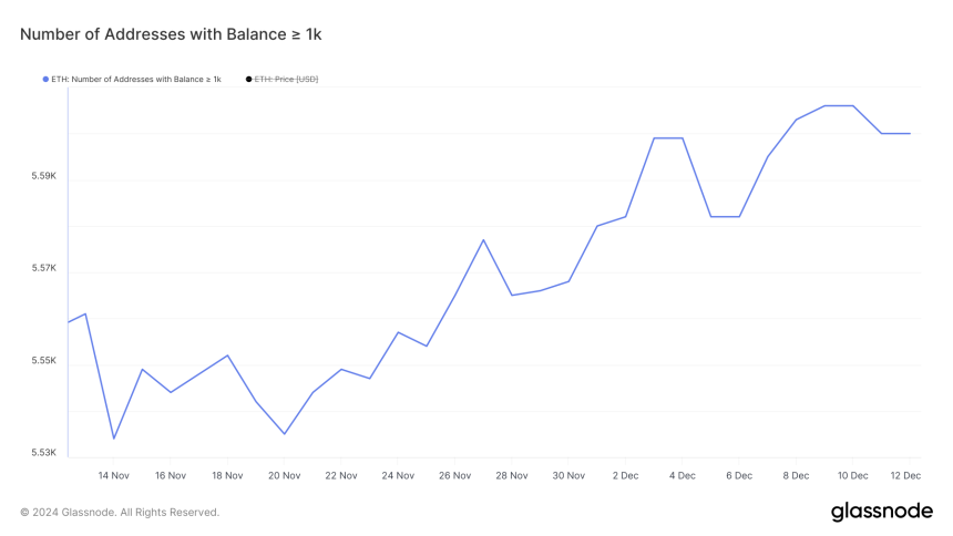 The number of Ethereum whales holding at least 1,000 ETH has steadily increased since mid-November, rising from 5,534 on November 14 to 5,600 currently. This trend highlights consistent accumulation by large holders, which can provide valuable insights into market dynamics.