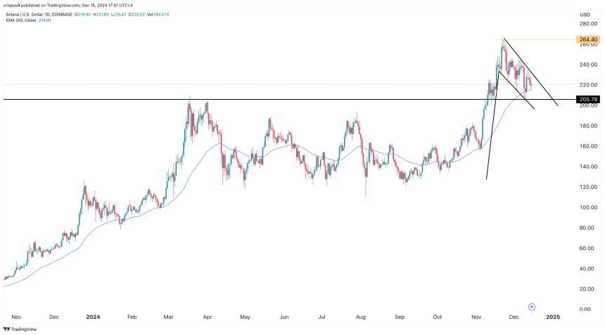 The daily chart shows that the SOL price peaked at $264.40 on Nov. 22. It pulled back to $220, but dropped and retested the crucial support level at $205 — the highest swing in March this year, and the upper side of the cup and handle pattern.