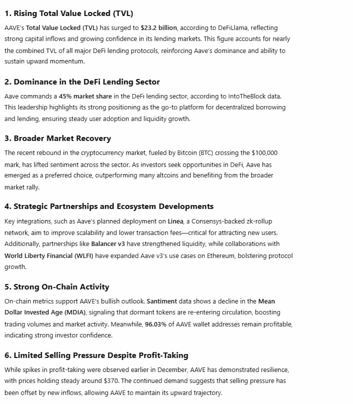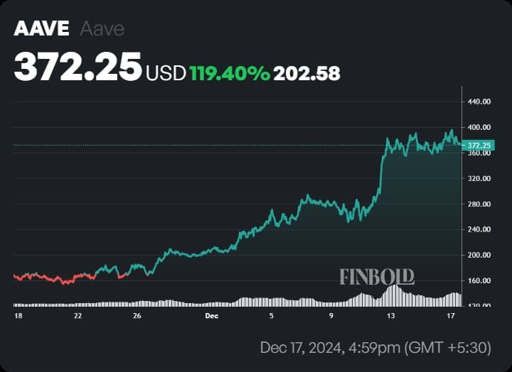 Aave (AAVE), the leading decentralized lending protocol, has surged to its highest levels since 2021, reaching a peak of $397 on December 16.