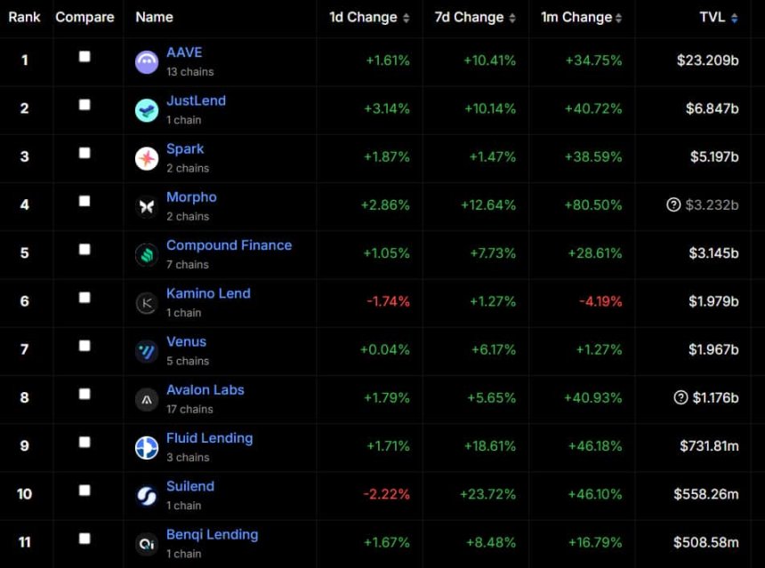 This dominance is further emphasized by Aaves staggering total value locked (TVL), which stands at $23.209 billion, according to DeFiLlama, almost equal to the combined TVL of all major lending protocols.