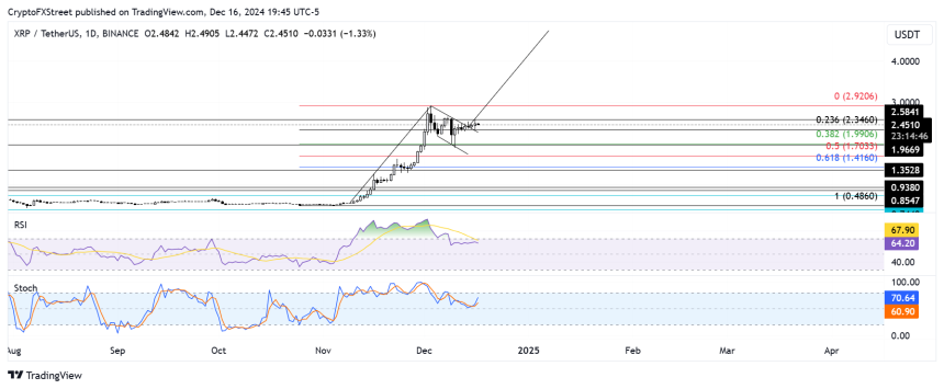 The remittance-based token validated a bullish flag pattern over the weekend with a breakout above the flag's descending trendline. XRP rallied further to test the resistance level at $2.58 on Monday after bouncing off the 23.6% Fibonacci Retracement level.