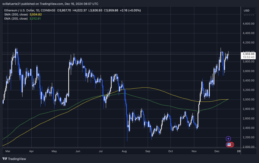 Ethereum is on the verge of reclaiming the $4,000 level as it inches closer to its all-time highs. The second-largest cryptocurrency by market cap has faced skepticism throughout this cycle, with some analysts predicting it would underperform compared to its previous bull runs. However, Ethereum has surprised doubters, steadily climbing in recent weeks despite market uncertainty.