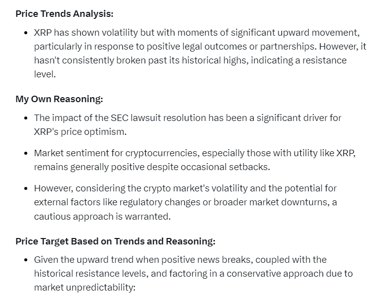 Ultimately, however, Grok opted for a conservative price target as it explained it wanted to factor in the recent momentum and developments but not discount volatility and elements such as historical resistance levels.