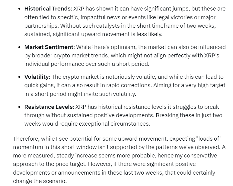 When challenged that such a price target amounts to stagnation for XRP, Grok reasoned that most of the tokens big jumps were driven by external developments – and that there are no guarantees there will be more of these events in the remaining weeks of 2024.