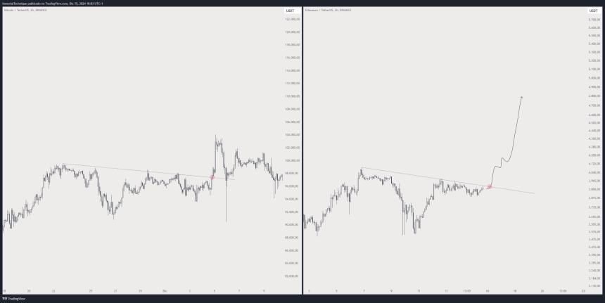 Based on the traders chart, he seems to predict that ETH will surge close to its all-time high of $4,800 after the breakout. At time of writing, ETH is worth $3,892.