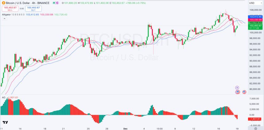 On the other hand, we see that the Awesome Oscillator indicates bearish momentum as its below zero and decreasing. Bitcoin traded at $102,480 as of press time, representing a 1.96% decrease over the last 24 hours.