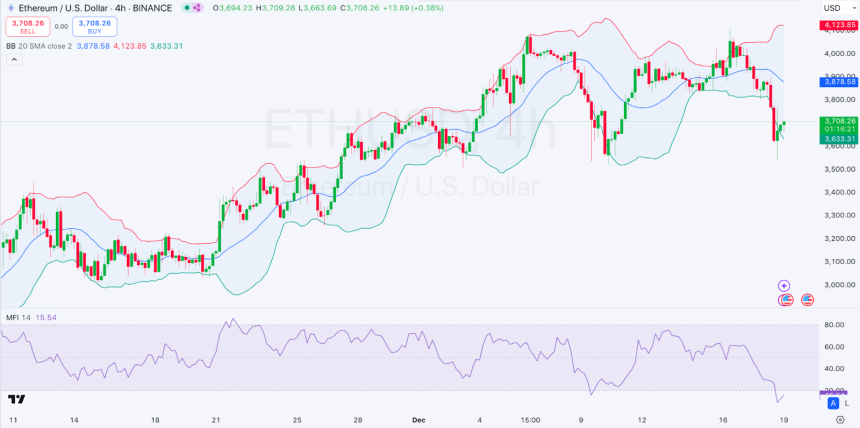 On the other hand, we see that the support is forming around $3,700 with near-term resistance at the middle Bollinger band around $3,878. Ethereum traded at $3,705 as of press time, representing a 4.31% decrease over the last 24 hours.