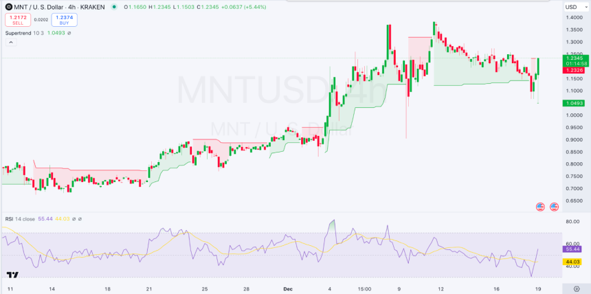 The support can be seen at the cloud‘s lower boundary near $1.05, with resistance at the cloud’s upper edge near $1.23. Mantle traded at $1.23 as of press time, representing a 3.06% increase over the last 24 hours.