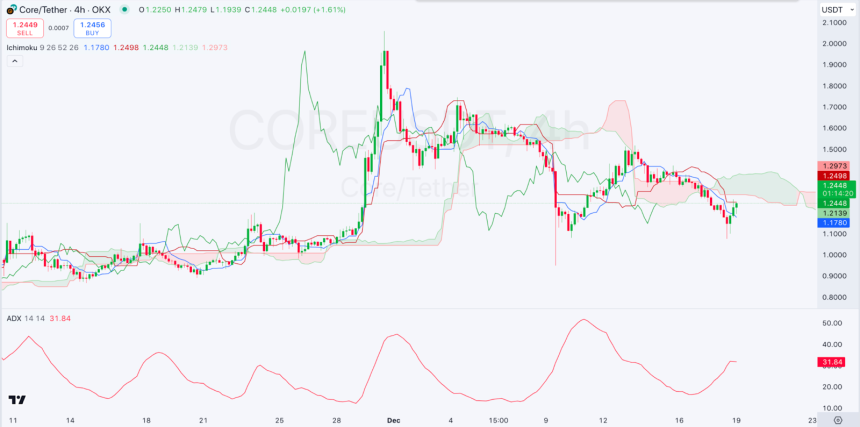 On the other hand, we see that the immediate resistance lies at the bottom of the Cloud around $1.24. Support appears firm near $1.18. Core DAO traded at $1.241` as of press time, representing a 0.05% increase over the last 24 hours.
