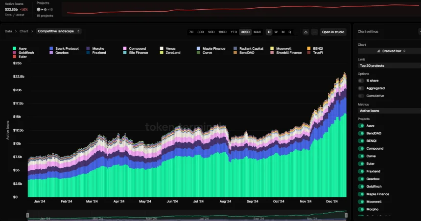 On-chain loans have exceeded $22.85B, as lending protocols from 2021 were replaced by new hubs. The market for DeFi lending has recovered from the crash following the Terra (LUNA) unraveling, as well as the subsequent crash of FTX.