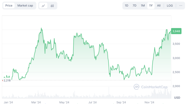 With the end of 2024 quickly approaching, Ethereum records a year-to-date gain of over 70%, significantly falling behind other leading cryptocurrencies such as Bitcoin and Solana, which rose by 142% and 107%, respectively.