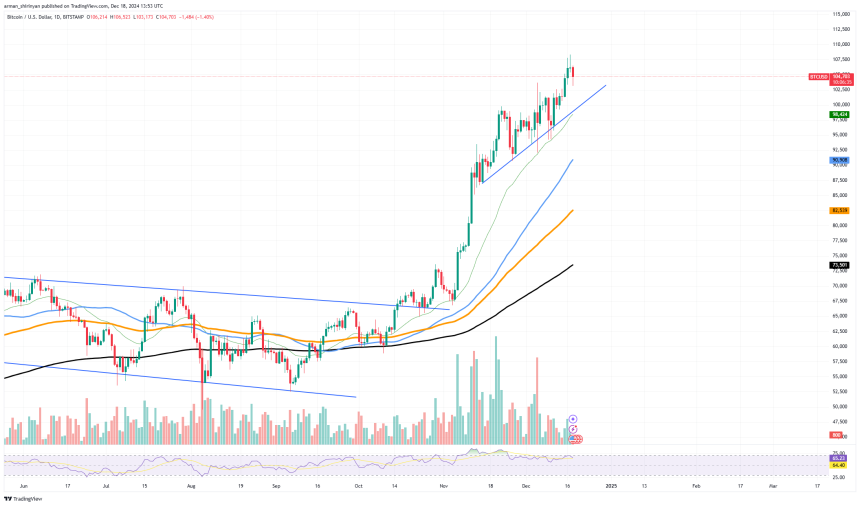 Bitcoin's New Year rally has stalled, prompting concerns about whether the bullish momentum is weakening. According to the given chart, Bitcoin is currently trading at $104,899, a 1.21% decrease after retracing slightly after reaching $106,214. The overall trend is still bullish, but fatigue is beginning to show. The chart's important finding is how closely Bitcoin sticks to its rising trendline.