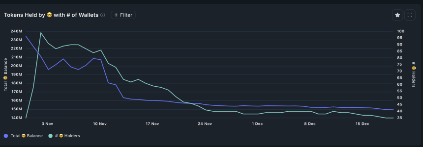 The same trend is happening in Brett, where the number of smart money holders and their balances have dropped in the past few weeks. Brett has about 40 smart money holders, while their balances have fallen to their lowest level in months.