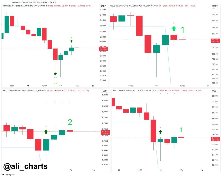 Ali Martinez tells his 101,300 followers on the social media platform X that the Tom DeMark (TD) Sequential Indicator presented buy signals on the four-hour charts for XRP, SOL, Maker (MKR) and World Network (WLD).