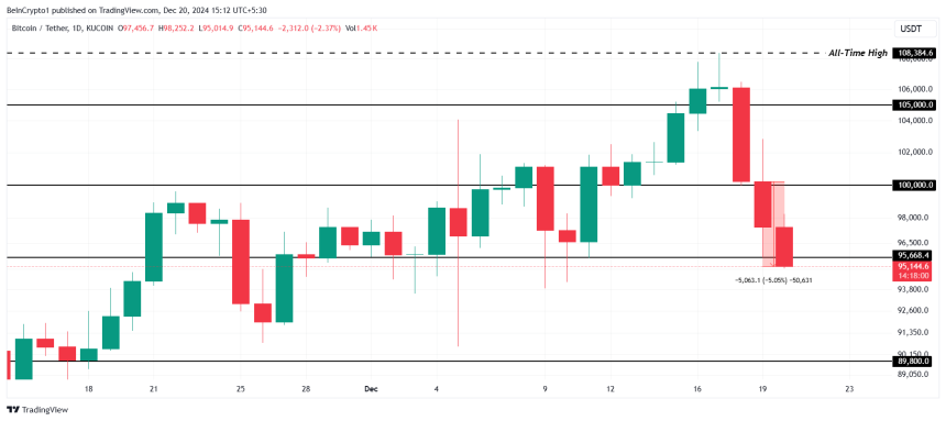 Bitcoin is expected to find immediate support around $95,000. Currently trading at $95,144, the cryptocurrency could recover if market sentiment stays positive.