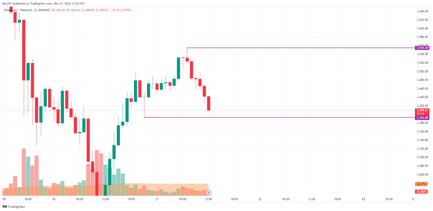 On the hourly chart, the price of ETH is approaching the local support of $3,393. If a breakout happens, the correction may continue to the $3,300 range shortly.