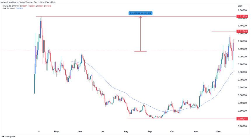 The daily chart shows that the ENA price bottomed at $0.1951 in September and has jumped by 445% to the current $1.0825. The coin has moved above the 50-day moving average and the psychological level at $1.00.