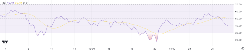 Shiba Inu Relative Strength Index (RSI) is currently at 40.4, down from approximately 57 just two days ago. This significant drop indicates a loss of buying momentum, with the market leaning toward a bearish sentiment.