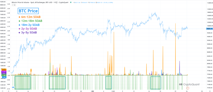 With this performance, BTC‘s on-chain data has been brought to the spotlight to uncover the factors driving recent selling pressures and investor behavior. One key focus has been the Spent Output Age Bands (SOAB) indicator, which provides valuable insights into Bitcoin holders’ activity based on their holding periods.