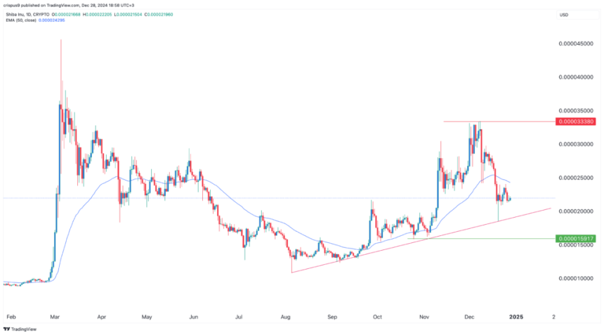 The daily chart shows that the SHIB price has dropped sharply after peaking at $0.000033 in December. It has fallen and moved slightly below the 50-day moving average.