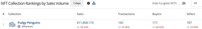 Trading activity for Pudgy Penguins NFTs has slowed. CryptoSlam reports a 78.2% drop in sales volume over the past week, with transactions reaching $11.86 million.