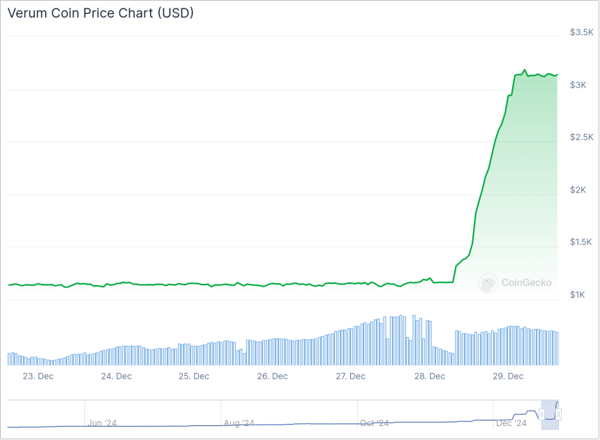 On Dec. 29, VERUM price hit a new all-time high above $3,163 – a new ATH that meant the tokens value traded at levels over 2,200% higher than its all-time low of $131 reached in June 2024.