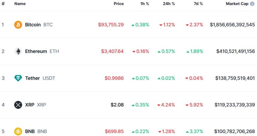 According to CoinMarketCap data, the leading cryptocurrency, Bitcoin, is down 1% and 2% in the past day and week, respectively, at $93k. The second largest digital asset Ethereum has added 2% in the past week.