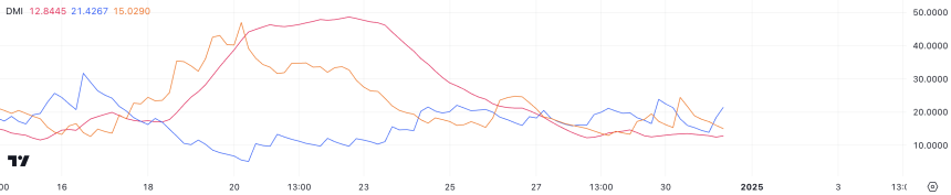 ETH DMI chart indicates that its ADX is currently at 12.8, remaining below 20 since December 27. This low ADX reading suggests that the trend strength is weak, reflecting a lack of strong momentum in either direction.