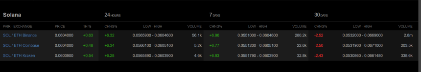 On Binance, SOLs price rose 6.32% over the last 24 hours and recorded a 6.96% gain over the past seven days. Coinbase and Kraken reported similar 24-hour increases of 6.34% and 6.28%, respectively. Binance also leads in trading volume, with 56.1k SOL/ETH pairs traded in the last day, while Coinbase and Kraken follow with 5.2k and 4.6k, respectively.
