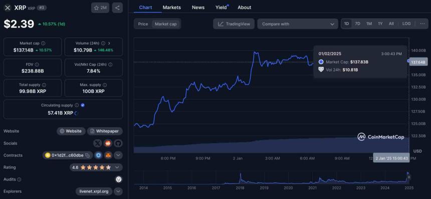After hitting lows of $2.01 on December 31, the cryptocurrency climbed to an intraday high of $2.44 during Thursdays trading session. If XRP closes today in positive territory, it will mark the third consecutive day of gains, signaling a strong recovery and potential for continued bullish movement.
